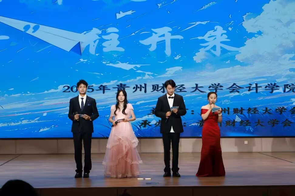 为迎接2025级新生的到来,展现会计学子风采。我院于2025年10月14日在贵州财经大学(东区)文津报告厅举办了“赓续薪火·‘计’往开来”2025年迎新晚会。校团委副书记(主持工作)杨兆瑞、会计学院党委书记王志亮、党委副书记黄忠莉、各年级辅导员及教师代表们莅临现场,300余名学生观看本次晚会。