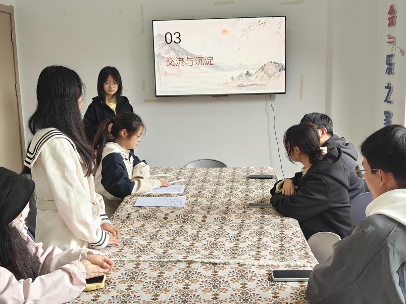 活动伊始,张译尹同学从重阳节的起源讲起,引导同学们深入探究这一传统节日的历史渊源和习俗,体验传统文化的博大精深。接着,围绕“人间温情”“历史传承”和“哲学生命”三大主题,同学们展开了内容丰富的读书分享,涉及现代温馨故事、千年家训以及对精神境界追求的体会。通过阅读和讨论,大家在书籍中领悟了重阳节的精神实质,继承了重阳节的传统习俗,并积极成为连接过去与现在的纽带。在分享环节之后,同学们结合个人成长经历交流了各自的感悟,在思想的交锋中进一步加深了对节日意义的理解。活动的尾声,大家拿起笔来撰写明信片,向亲朋好友传递了真挚的祝福,将活动的文化价值转化为具体的情感交流,使得重阳节的温情与书香的深沉相辅相成。