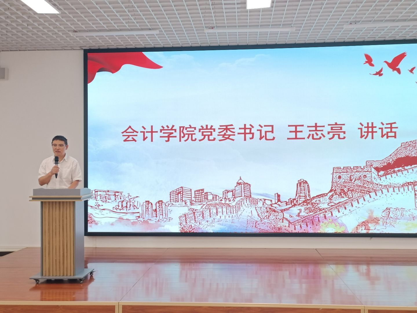 会计学院党委书记王志亮总结讲话,向即将卸任的学生干部表示最衷心的感谢,向新一届的学生干部提出了三点期望:一是要牢记全心全意为同学服务的宗旨,用实际行动当好同学们的“贴心人”和“代言人”;二是要积极探寻新方法、新路径,让组织焕发活力,让学生活动有创新、有特色、有“味道”;三是要以团结为本,凝聚团队力量,让团队成为每位学生成长的温暖港湾。同时,王志亮强调,我校本科教育教学审核评估工作即将正式展开,希望学生党建工作中心、团委•学生会、研究生联合会能充分发挥好学生干部的带头作用,当好“信息传递员”和“行动示范员”,带领广大学子在我校本科教育教学审核评估工作中主动作为,为贵财发展贡献个人力量。
