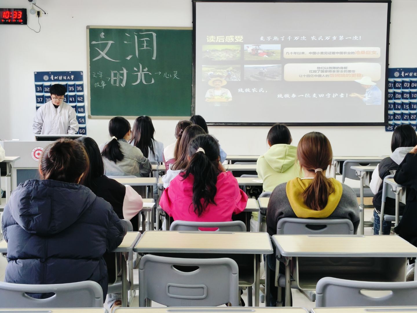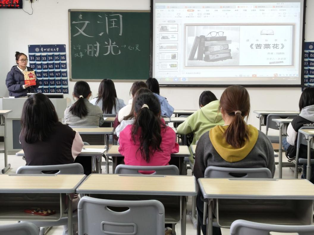 活动伊始,张荣轩同学通过“藏知识、藏故事、藏智慧”三大板块,为现场同学打造了一场兼具文化温度与思想深度的交流盛宴。她不仅鼓励同学们借安静时光积累知识,还特别推荐了三本书籍,既帮助大家挖掘阅读乐趣,提供了兼具思想深度与阅读温度的读物,也为同学们增添了更多有深度的阅读选择。在书籍分享环节,同学们踊跃登台,有的共情《苦菜花》里冯大娘一家的抗争与牺牲、军民的不屈与坚守,有的沉浸《太阳照在桑干河上》里贫苦农民的苦难与觉醒、翻身路上的挣扎与新生,还有的分享实用工具书带来的时间管理方法等等。同时,杨胜丽老师还分享了个人的阅读习惯,建议同学们将专业书籍与人文读物相结合,通过广泛阅读来拓宽自身的认知边界,以人文书籍滋养心灵、沉淀思想,让阅读成为助力成长的持久动力。活动最后,在张荣轩同学的带动下,大家走到台前的黑板前,拿起粉笔写下了自己专属的冬日关键词,“快乐”“充实”“奋斗”等字眼字眼错落排布,为这场读书交流会画上了圆满的句号。