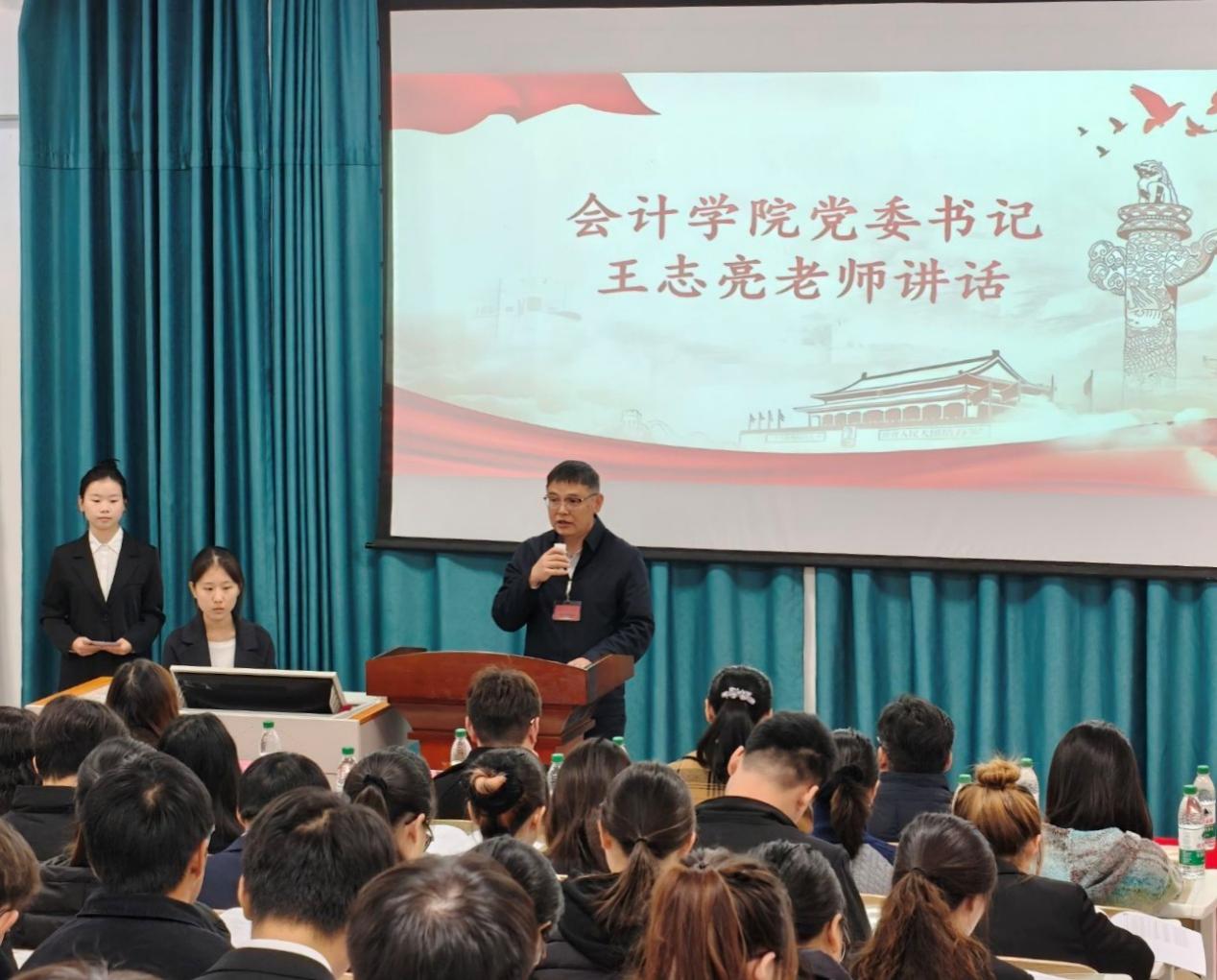 会计学院党委书记王志亮讲话,他对学生代表提出了三点期许:一是做理想坚定的表率,把个人理想锚定民族复兴征程,将红色基因融入血脉;二是做勤学读书的表率,在学习中展现智慧,在竞赛中勇于攀登;三是做担当实干的表率,立足学业科研,脚踏实地、精益求精,在国家发展的关键领域、社会需要的重要岗位上发光发热,用实干书写无愧于青春、无愧于时代的精彩答卷!