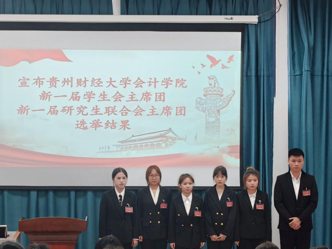 按照大会议程,会计学院学生会代表杨雯雯、研究生联合会代表朱玉分别向大会作工作报告。随后,各代表团在团长的带领下,学习领导讲话精神,讨论了工作报告,各代表积极建言献策,为未来的工作提供了宝贵的意见和建议。最后,大会严格按照选举程序,选举产生了贵州财经大学会计学院新一届学生会(研究生联合会)委员会委员、会计学院新一届学生会(研究生联合会)主席团。新一届主席团上台与各代表见面。