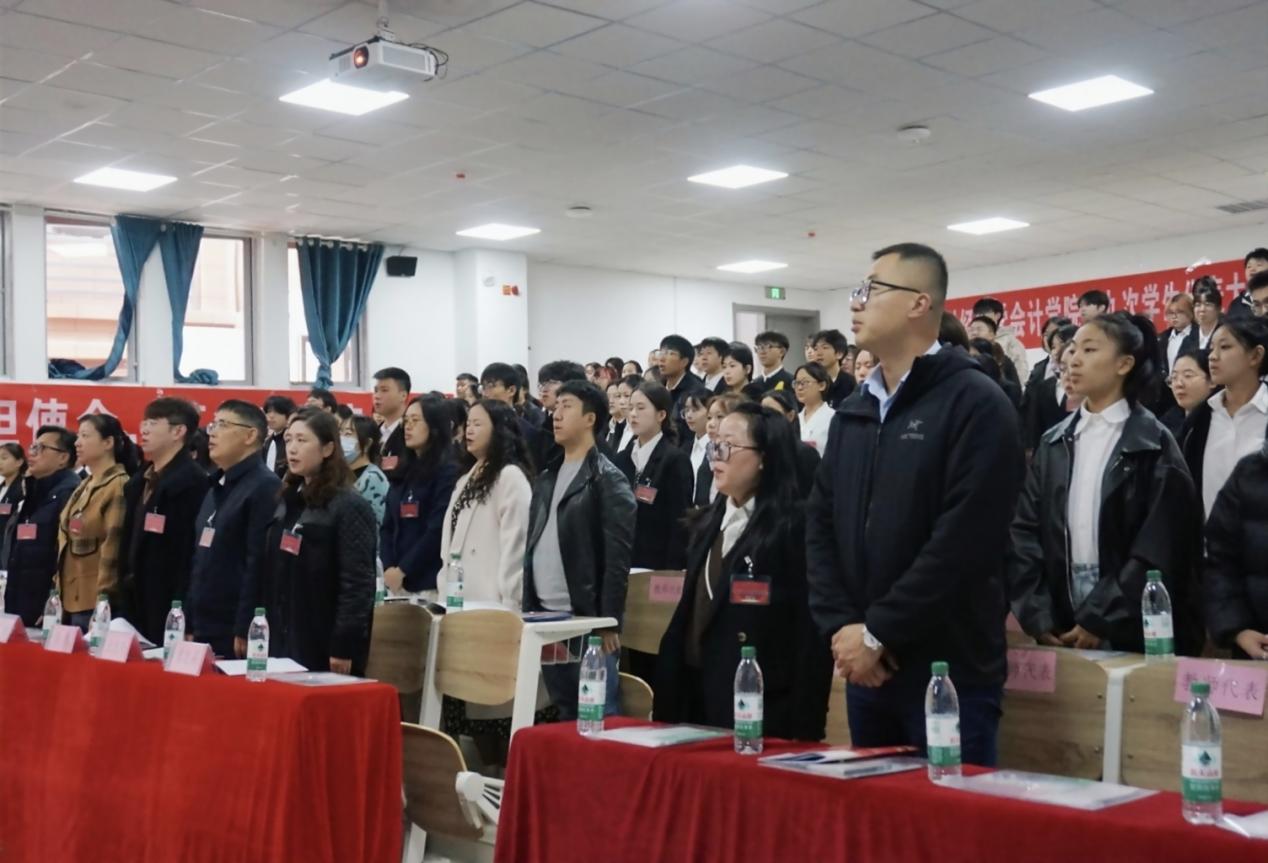 此次大会在激昂的国歌声中拉开帷幕。会上,校团委副书记陈伟向大会致辞,他对此次大会的召开表示热烈的祝贺,并对会计学院过去取得的显著成绩给予高度肯定。同时他对学生代表提出殷切期望,希望大家争当先锋、做好标杆,既要树立正确的是非观、正义感与责任感,心有底线、行有准则,立足当下敢担当、善作为;也要始终保持昂扬自信、蓬勃锐气与饱满干劲,带头把艰苦奋斗的底色、严谨务实的作风融入青春征程,团结引领广大青年同向同行;更要以青春之我、奋斗之我,争做堪当时代大任的新青年,让青春在党和人民最需要的地方绽放绚丽之花!
