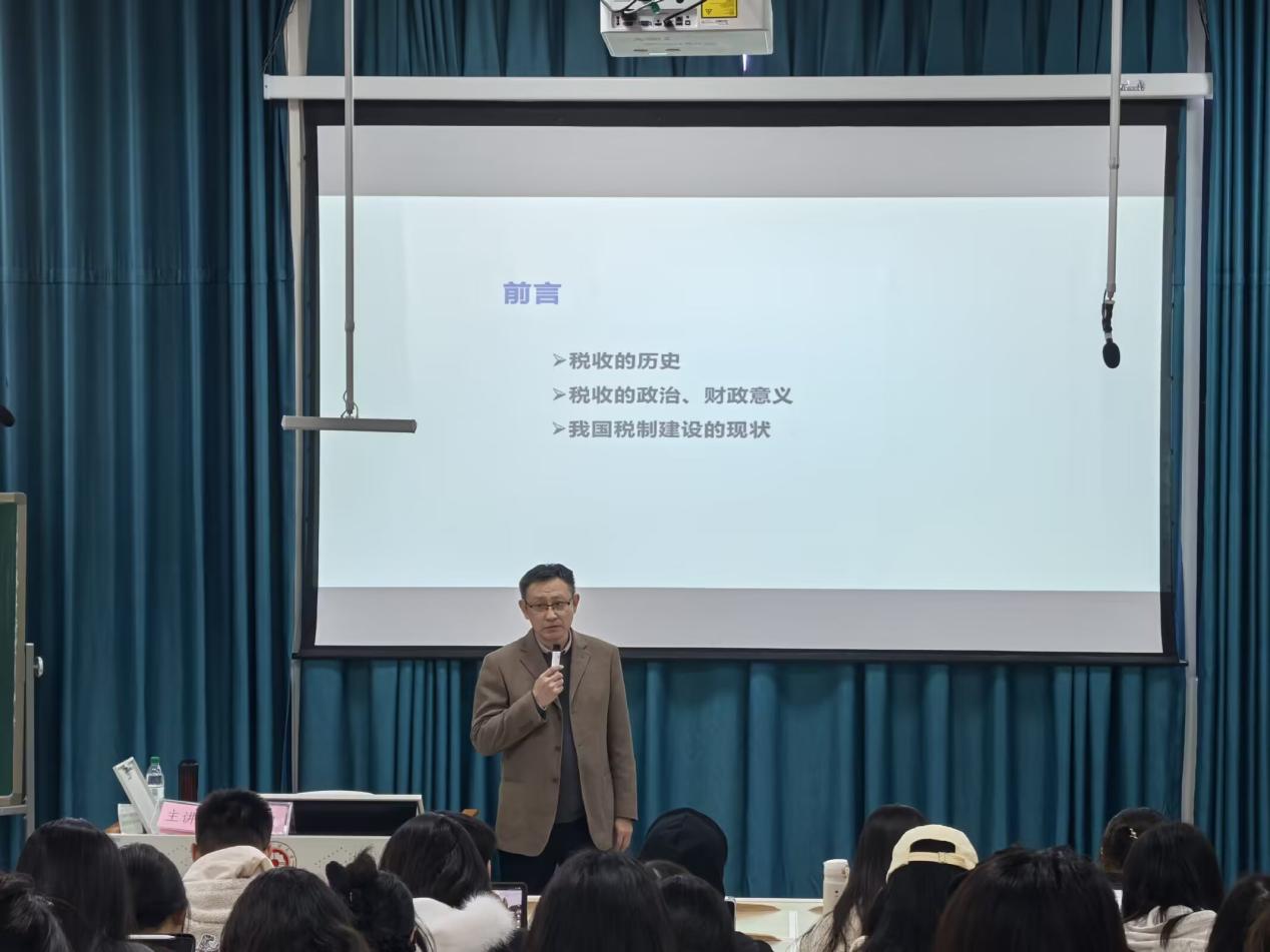 讲座中,肖昀老师围绕税收的历史、税收的政治与财政意义及我国税制建设的现状三大核心板块展开宏观解读。以详实的数据、清晰的逻辑,从政策背景、系统升级、风险防控等维度,为现场学生全景式解读金税工程的发展脉络与纳税人面临的税务新环境。通过梳理,肖昀老师帮助同学们更清晰认识到我国税收征管信息化的发展逻辑,将复杂的财税政策转化为可感知、可理解的实操要点,用层层递进的讲解为同学们搭建起财税知识学习的基础框架。